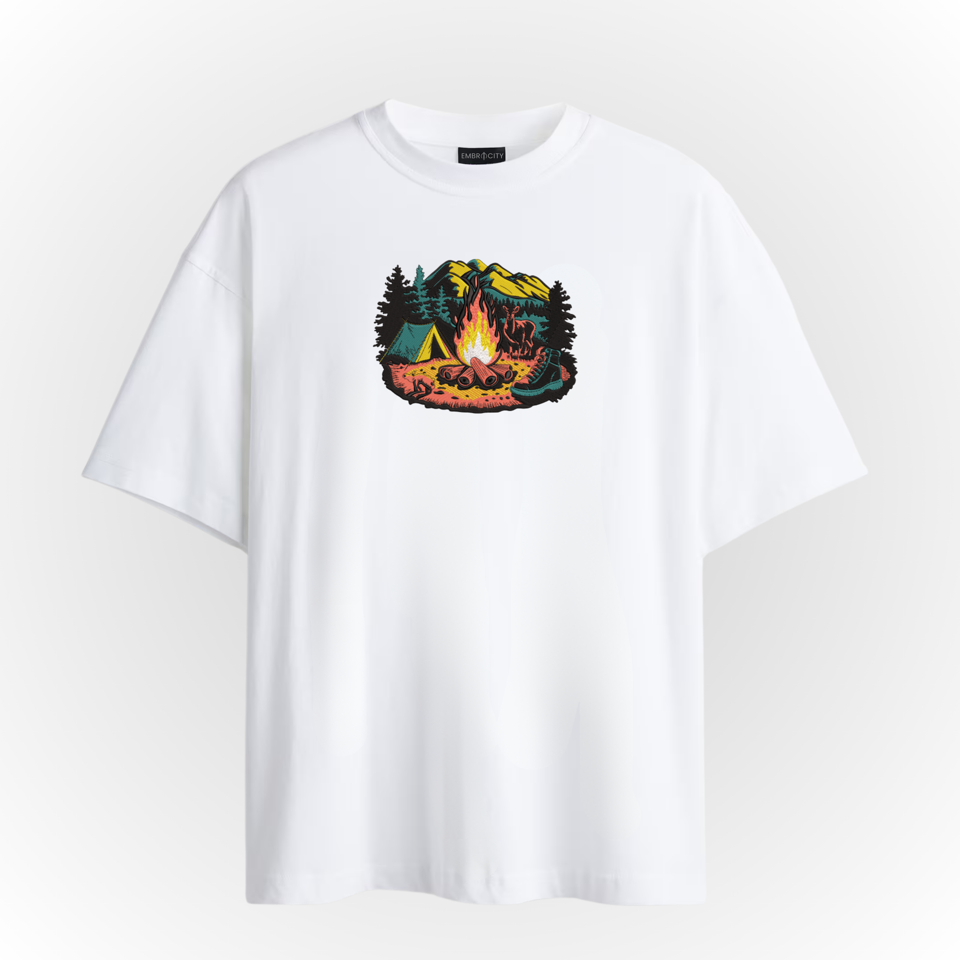Feel the warmth of the wild and the magic of moonlit tales with the Camping Fire T-Shirt — an oversized black tee featuring a beautifully embroidered campfire nestled between trees and stars. It’s a tribute to outdoor souls, those who chase sunsets, share stories by the fire, and find peace under open skies.